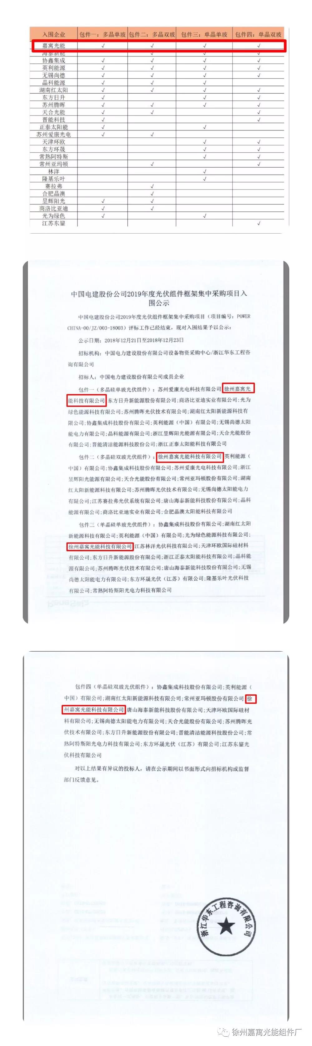 今日,中國電建股份公司公示了2019年度1GW光伏組件框架集中采購項目的入圍結果,徐州嘉寓光能的多晶單玻光伏組件、多晶雙玻光伏組件、單晶單玻光伏組件、單晶雙玻光伏組件四個標段全部入圍。